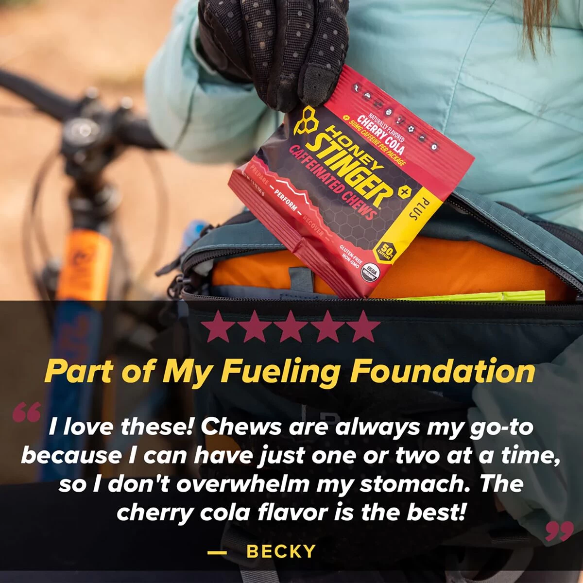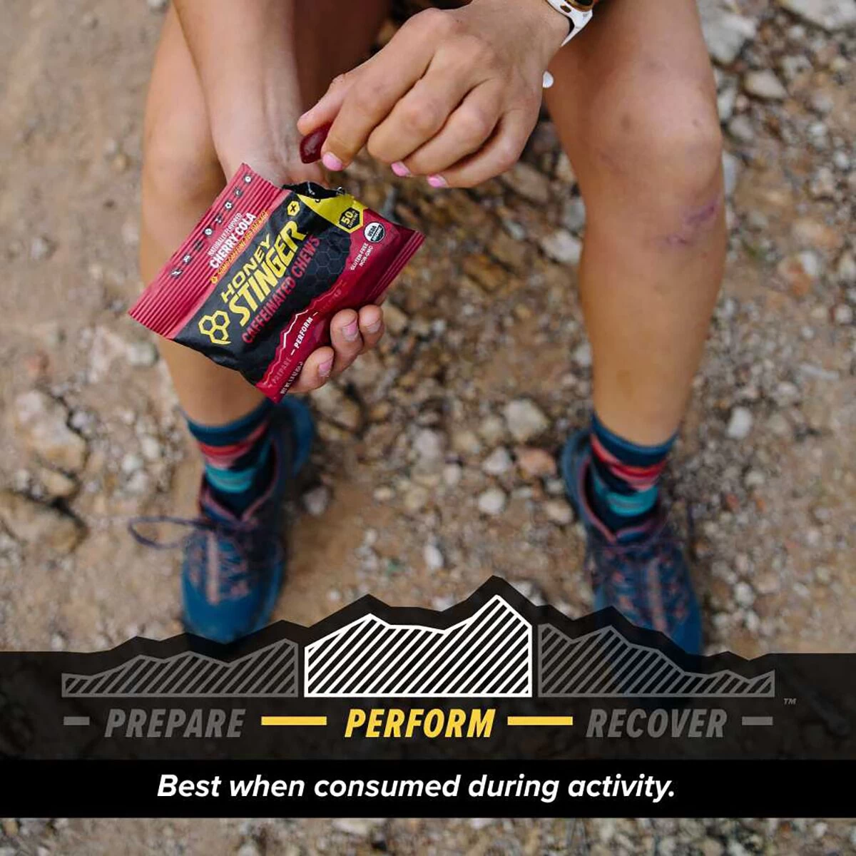 Prevent the bonk with a boost of energy from Honey Stinger Caffeinated Energy Chews. One pouch of these chewy snacks features two servings, each with 50mg of caffeine for sustained energy, electrolytes to replenish power, and a sweet taste to keep us coming back for more.
